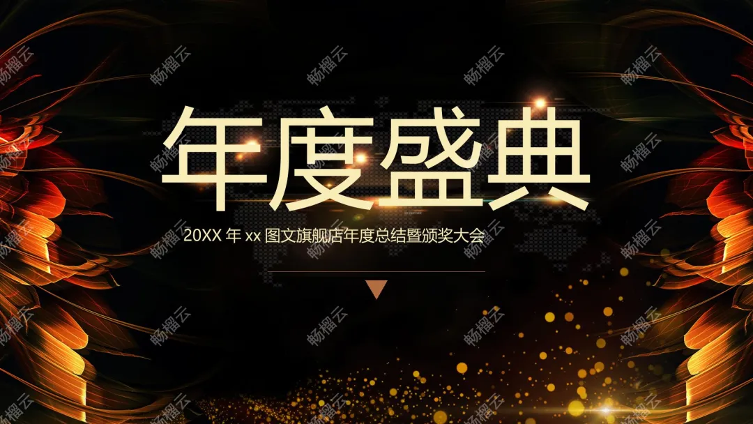 专为20XX年xx图文旗舰店打造的年度总结暨颁奖大会PPT,是品牌梳理全年成果、表彰核心骨干、规划未来发展的专业演示工具。封面采用黑金底色搭配暖金、橙红撞色方案,左右对称橙红色渐变羽翼搭配金色光带,中央米黄色“年度盛典”大字点明主题;内容围绕“年度回顾-成果复盘-优秀表彰-未来规划”四大模块,可呈现营收数据、爆款业绩、服务成果等关键内容,预留灵活编辑空间,适配线下年会、内部复盘等正式场景。