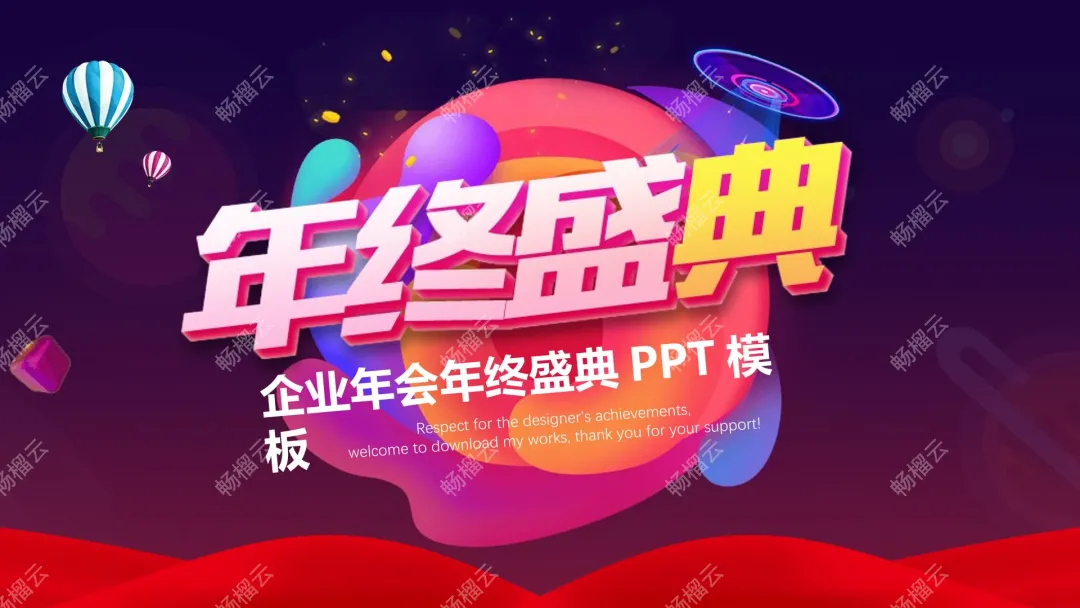 专为企业年会、年终盛典打造的免费PPT模板,凭借专业且喜庆的视觉设计,成为企业年末活动演示的优质选择。封面采用深紫色渐变背景,左侧热气球搭配紫色立体方块增添灵动气息,中间“年终盛典”艺术字采用粉白、黄粉差异化渐变设计,背景融入彩色流体、金色光点等元素;版式简洁清晰,预留多处可自定义编辑区域,无需复杂设计基础就能快速打造专业年会演示课件,满足各类企业年末活动需求。