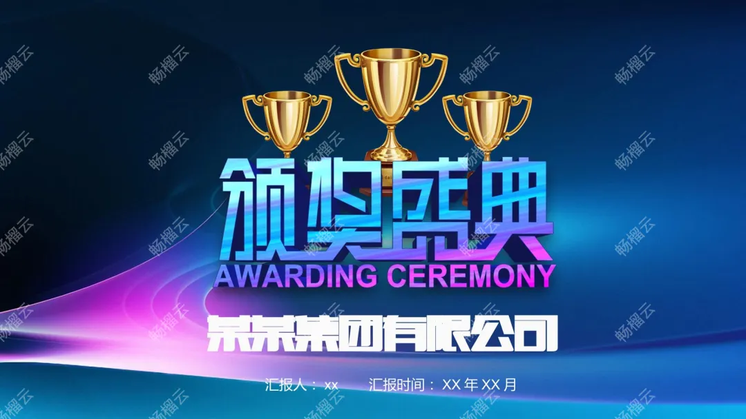 某某集团有限公司才艺表演活动汇报PPT,是企业内部活动复盘、成果展示的专业载体。封面采用渐变蓝紫色基底搭配光感曲线,上方三座金色奖杯凸显颁奖属性,中间蓝紫渐变“颁奖盛典”艺术字搭配英文标注强化正式感,底部明确汇报人及时间信息;正文详细记录活动核心环节,包括节目《双节棍》的演出人员信息,适用于向管理层汇报活动成效、部门间分享经验、企业文化建设存档等场景。