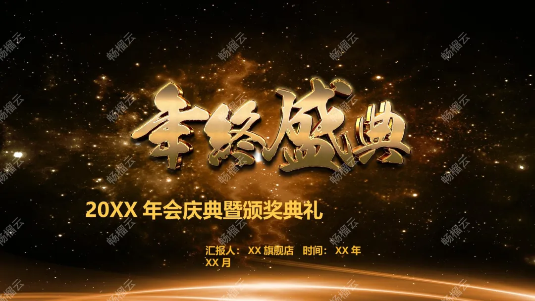 专为XX旗舰店打造的20XX年会庆典暨颁奖典礼PPT,是年终总结与荣誉表彰的专业视觉载体。封面采用黑金宇宙风设计,黑色背景搭配流动金色星云与星光,中央立体烫金“年终盛典”艺术字视觉冲击力强,下方清晰标注活动主题、汇报人及时间;内容涵盖年度回顾、成果展示、颁奖典礼三大核心模块,可梳理全年工作成果、展示荣誉奖项、指引颁奖流程,同步完整年会流程安排,帮助组织者高效把控活动节奏。