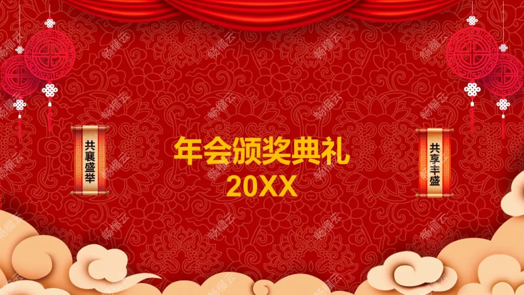 专为企业年会打造的「年会颁奖典礼20XX」PPT演示文稿,以浓郁喜庆的中式风格为核心视觉基调。封面以中国红为主色调搭配传统花纹背景,顶部红色幕布、两侧中式红灯笼与底部祥云图案营造年味,中央黄色主题文字搭配卷轴上的“共襄盛举”“共享丰盛”字样传递核心主题;内容涵盖年度业绩展示、员工才艺汇演、荣誉颁奖、年终狂欢氛围烘托等全流程环节,助力企业打造记忆深刻、流程顺畅的年终盛典。
