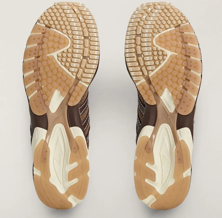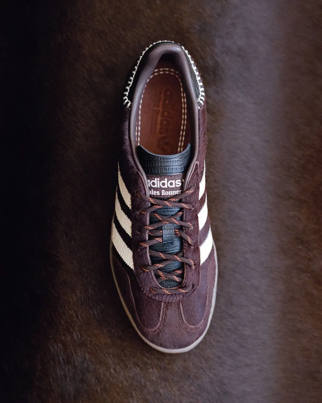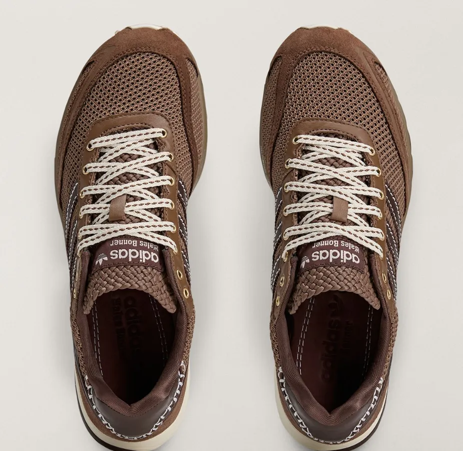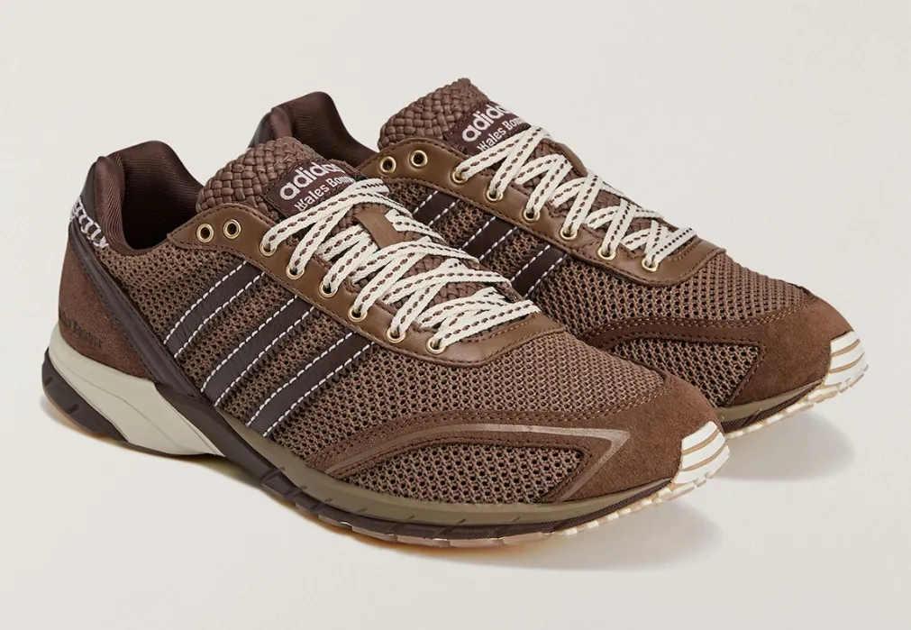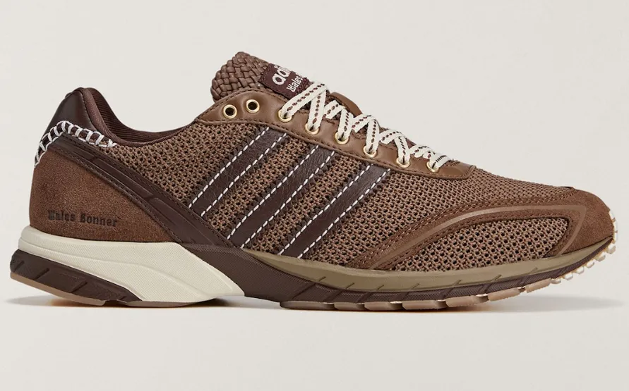 Adizero Adios跑鞋同样以棕色为主题,采用网眼织物鞋面搭配编制鞋舌和麂皮后跟,此外鞋侧带有Wales Bonner压印Logo,彰显特殊身份。