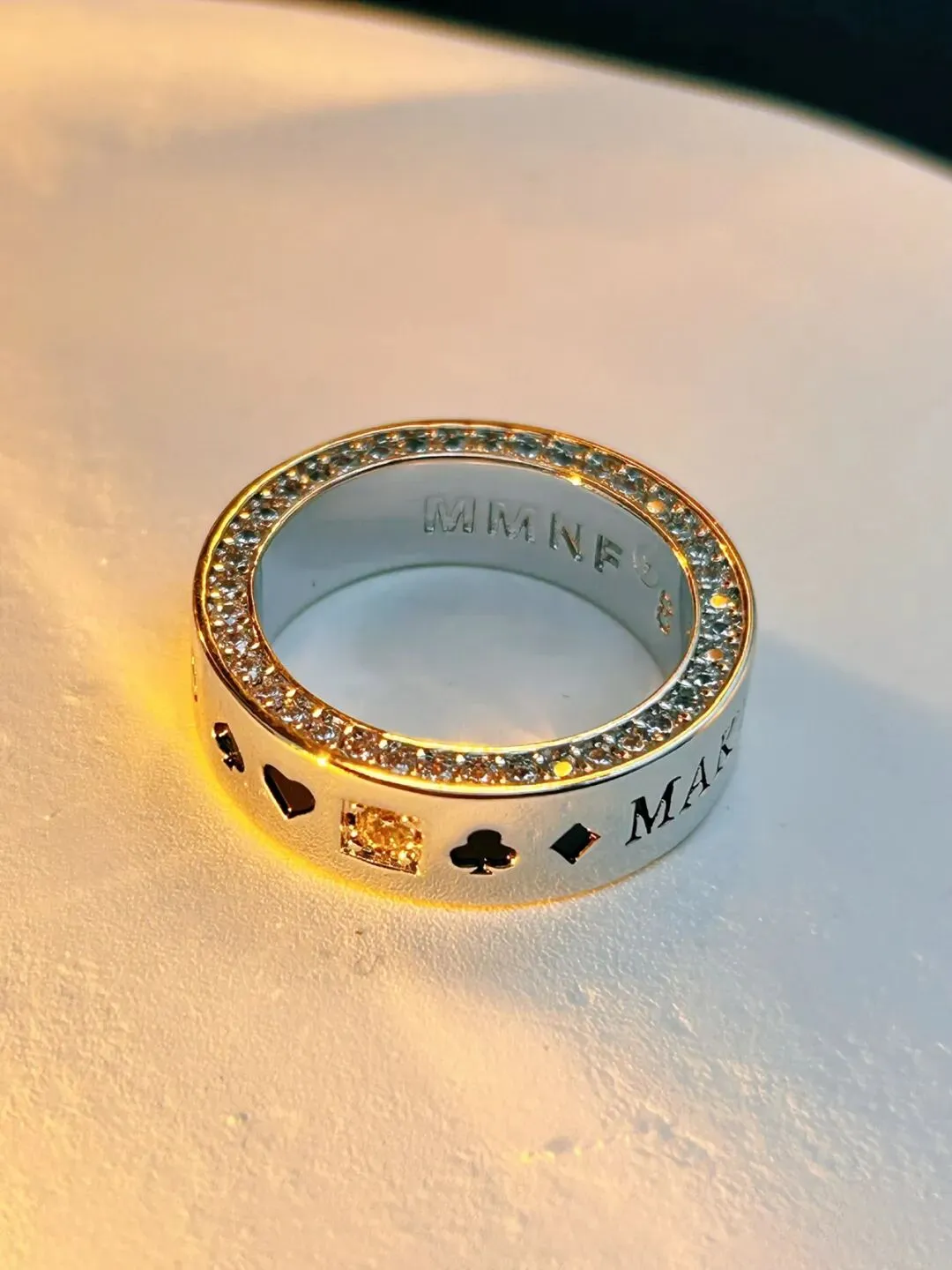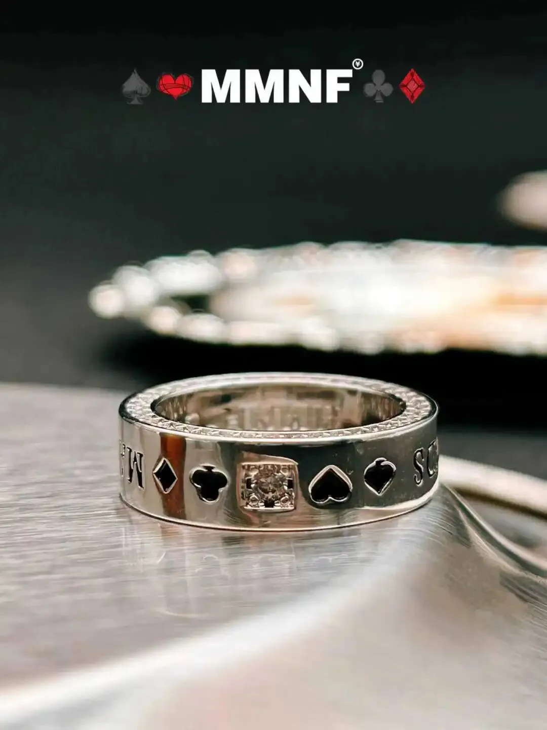 这里号外一下,限量「🃏全胜之戒👑」珐琅色工艺满钻戒指,新增全尺寸戒圈!可当做项链佩戴!戒指双侧满镶T钻钻石,戒面黑红梅方扑克花珐琅色点缀,内圈刻有经典镂空标语「赚钱不交朋友」。