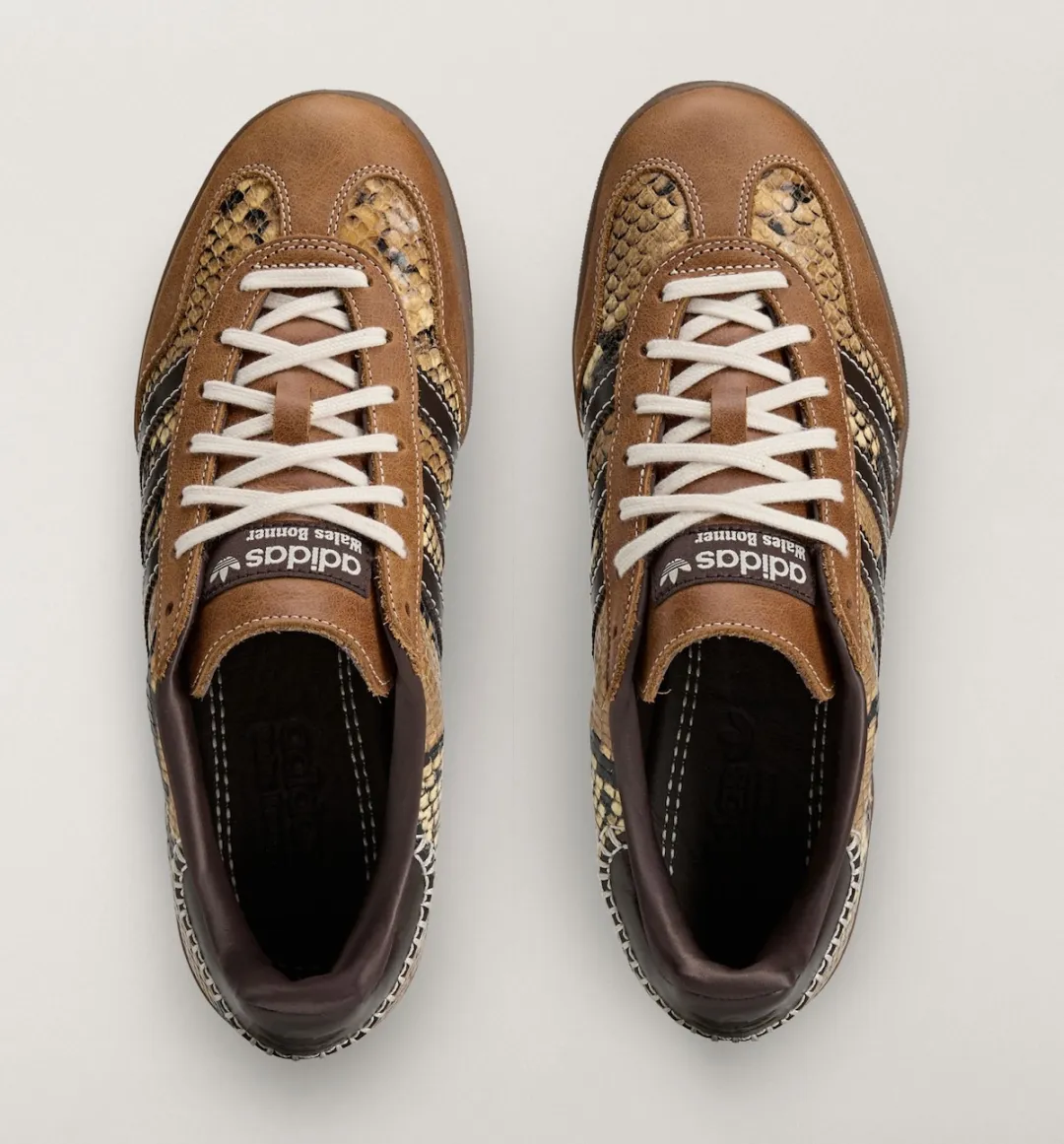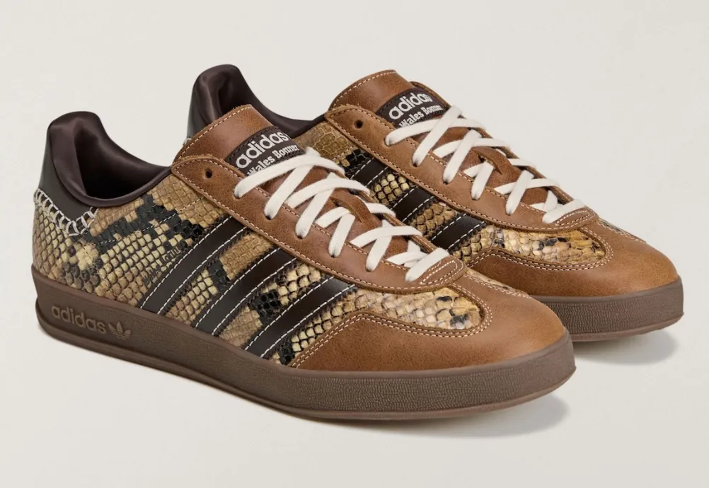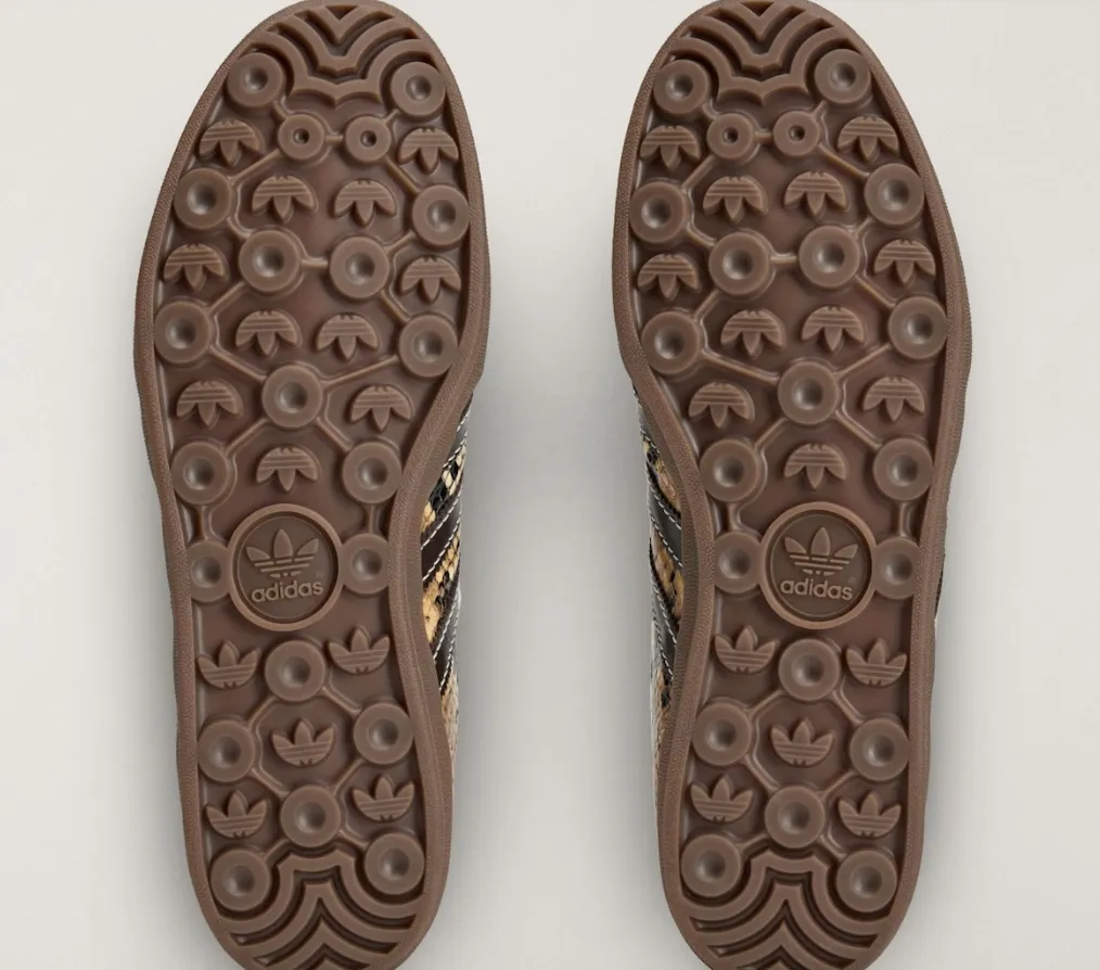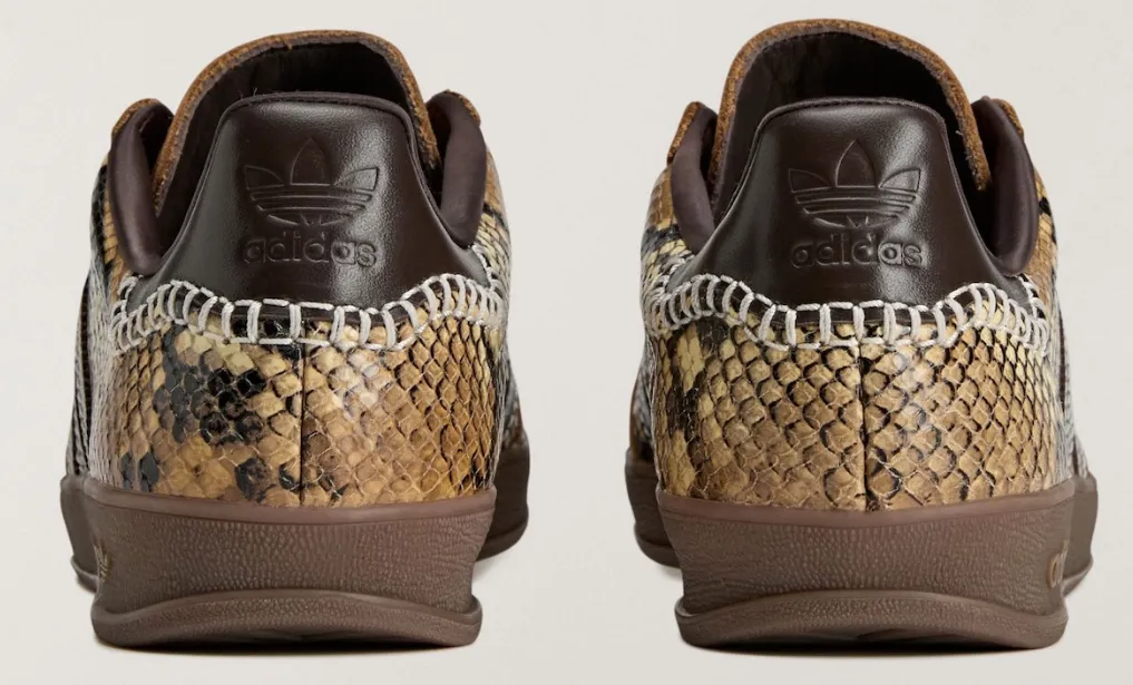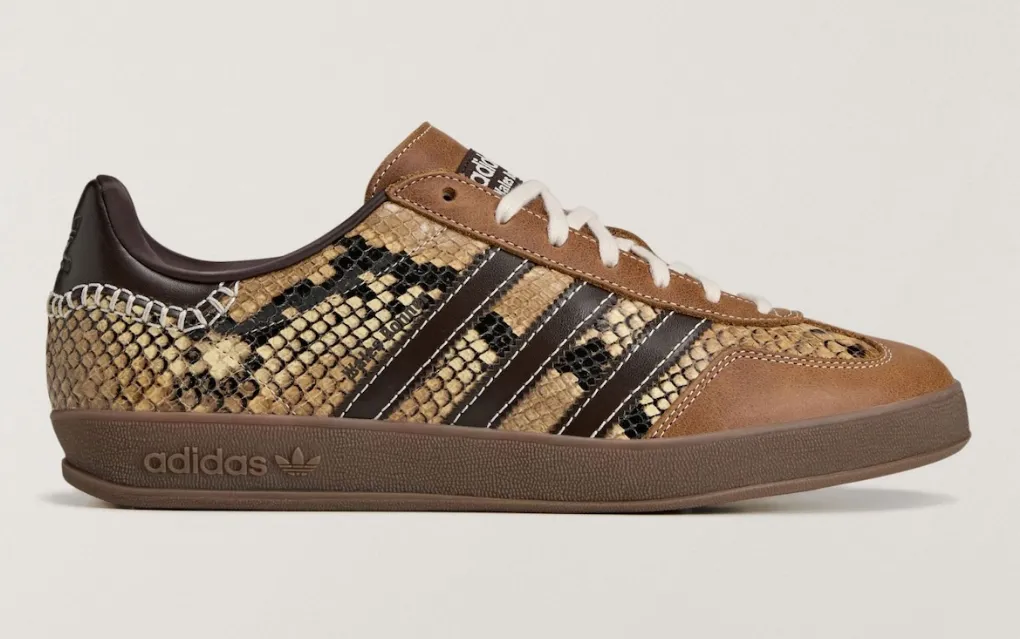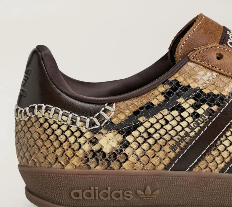 此番双方还带来了两款Gazelle indoor鞋型,其中一双以棕色蛇纹为主题,搭配浅棕色皮革和咖色缎面内衬,后跟则是标志性的编织细节,规格不低。