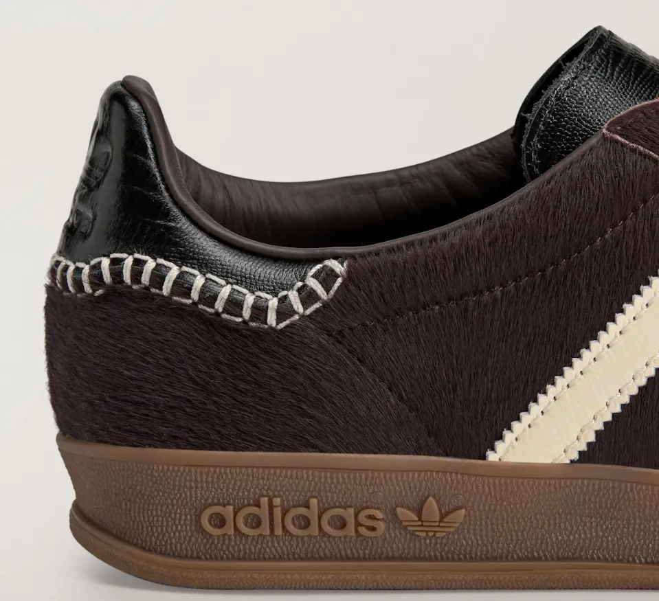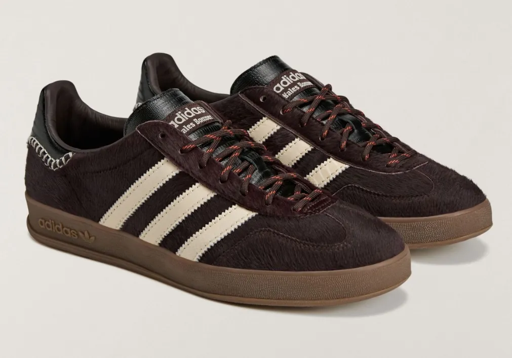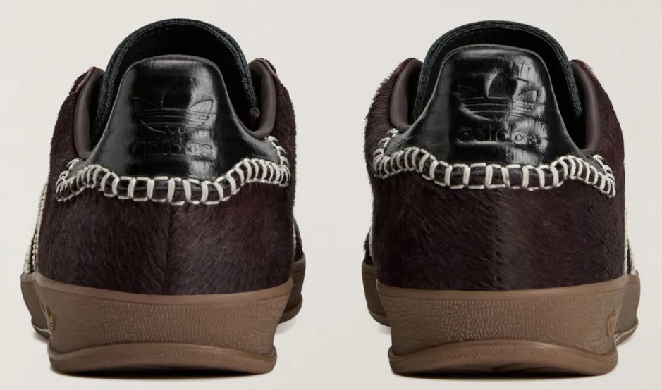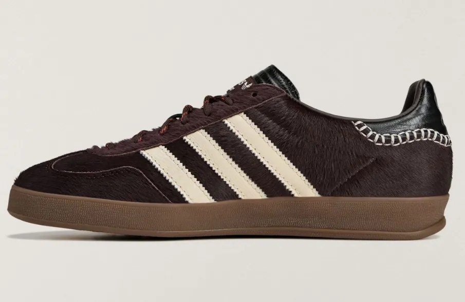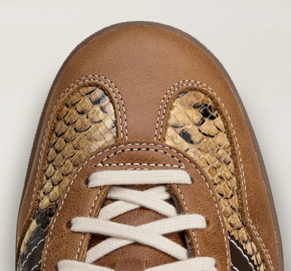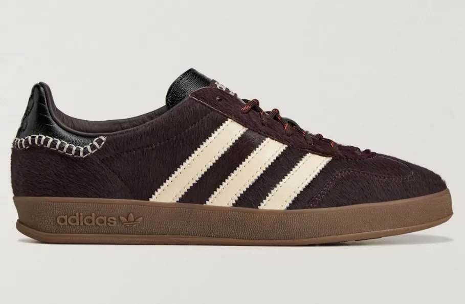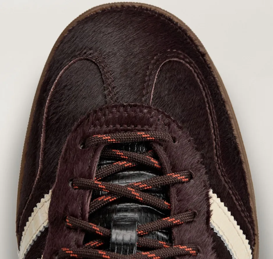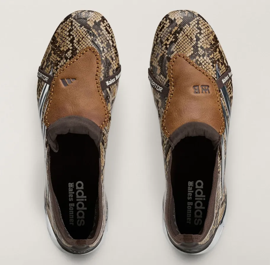 此番双方还带来了两款Gazelle indoor鞋型,其中一双以棕色蛇纹为主题,搭配浅棕色皮革和咖色缎面内衬,后跟则是标志性的编织细节,规格不低。