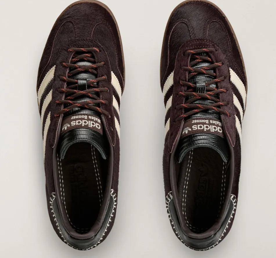 另一双则是通体酒红色马毛材质搭配同色系皮革内衬和黑色蛇纹鞋舌打造,三道杠位置同样以白色皮革搭配,质感拉满。