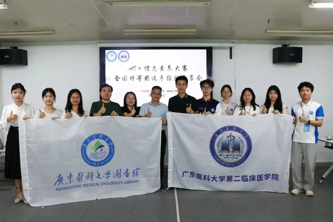 为了充分发挥榜样引领作用,助力同学们提升人工智能应用与信息检索能力,实现以赛促学、以学促用,2026年4月10日晚,由广东医科大学图书馆主办、第二临床医学院学生会承办的AI信息素养大赛全国特等奖获奖选手经验分享会,在学校东莞校区图书馆207会议室通过线上线下结合的方式圆满举行。图书馆馆长钟伟金老师、图书馆裴佩老师以及第二临床医学院王炳科老师,莅临现场出席活动。本次分享会特邀斩获2025年AI信息素养大赛全国联赛唯一特等奖的参赛团队成员朱泳豪、陈钰红、曾博慧三位同学,围绕人工智能应用与信息素养提升等核心内容开展专题经验交流,为在场师生带来了一场兼具专业性与实用性的学术分享活动。