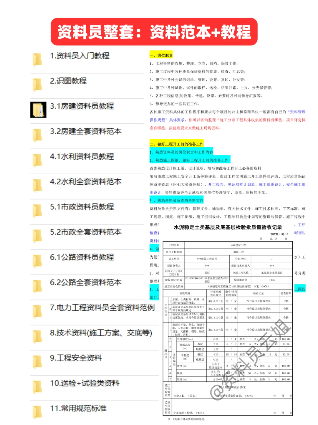 零基础也能看懂这套市政资料员教程。囊括道路桥梁排水全套资料范本,清晰列出组卷逻辑与检验批流程。解决你资料收集不全、填写不规范的实际痛点,是内业工作的好帮手。