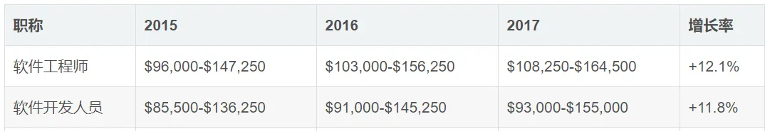 过去三年内软件工程师软件开发人员的薪酬范围和增长率: