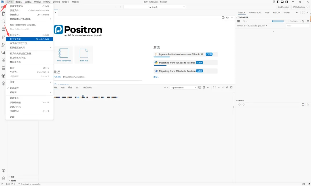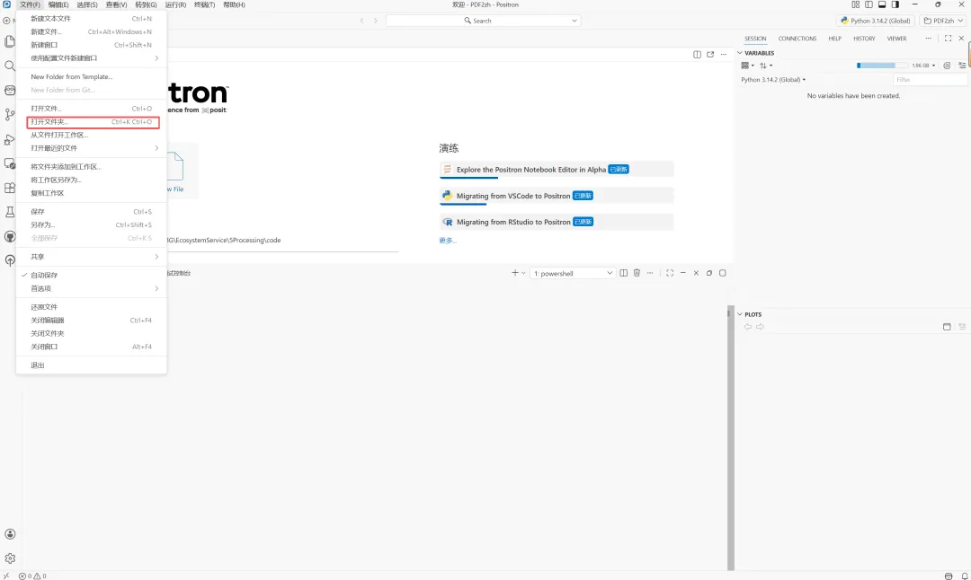 ① 在positron主界面左上角打开当时部署这一环境的PDF2zh文件夹,然后在终端输入“pixi run start”。