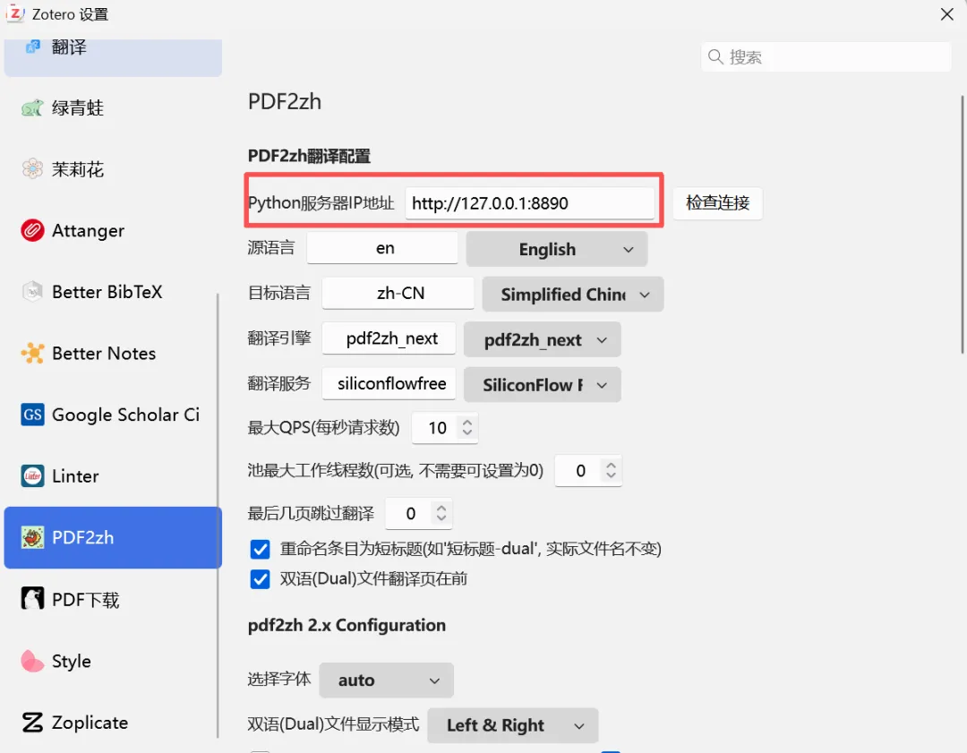 图3 zotero的pdf2zh设置界面