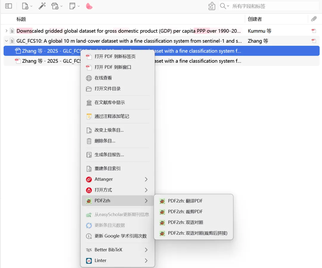 完成上面步骤,回到zotero界面找到一个pdf文件,右键选择“PDF2zh”,选择其中一种之后,回到刚刚的界面就能查看翻译的进度了。