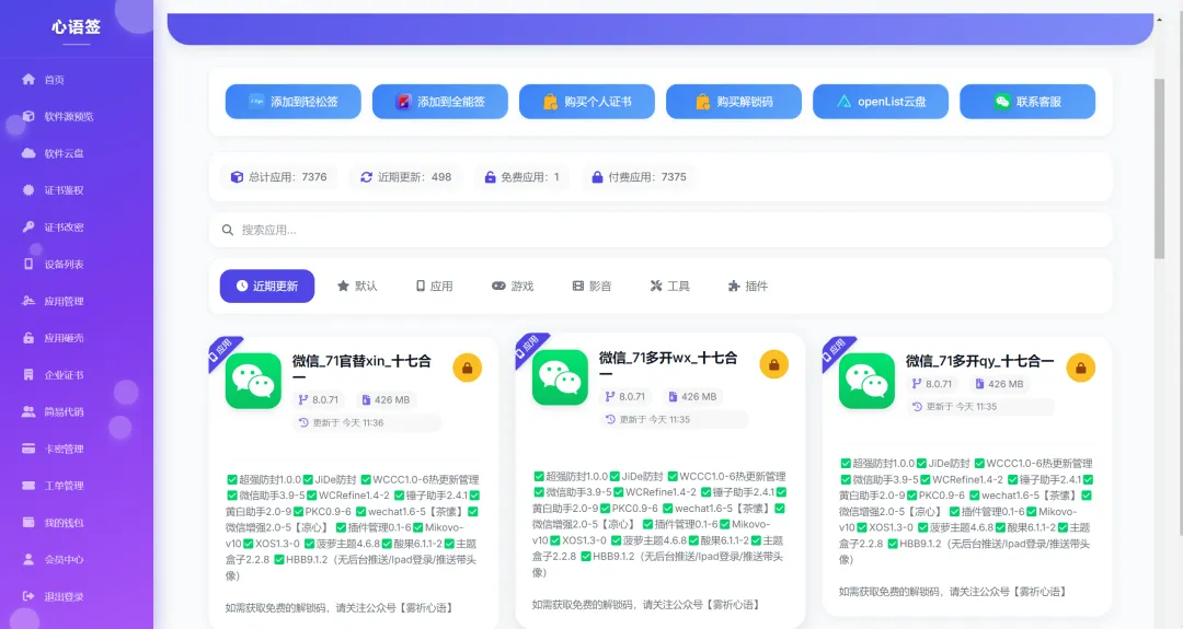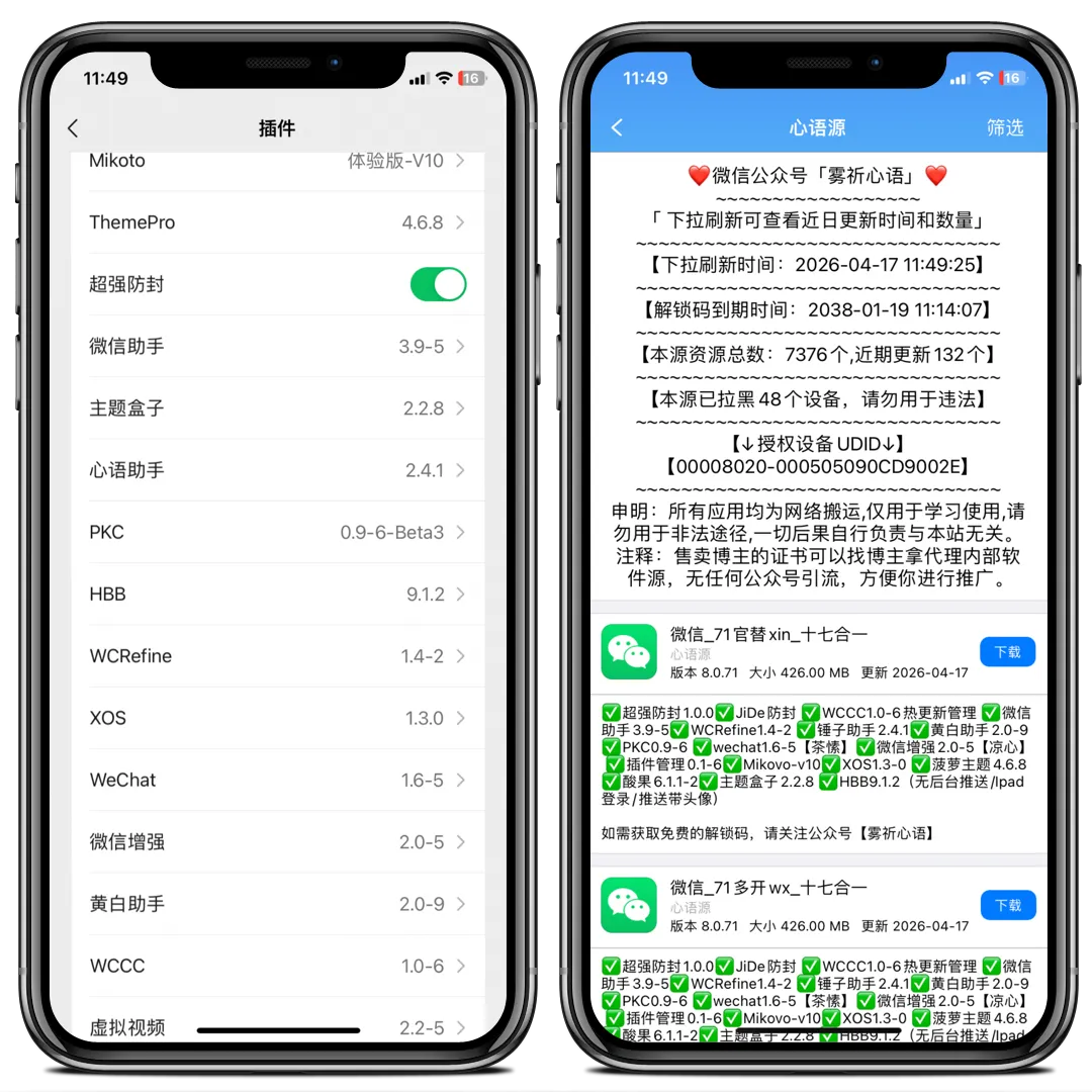 ✅超强防封1.0.0✅JiDe防封 ✅WCCC1.0-6热更新管理 ✅微信助手3.9-5✅WCRefine1.4-2 ✅锤子助手2.4.1✅黄白助手2.0-9✅PKC0.9-6 ✅wechat1.6-5【茶愫】✅微信增强2.0-5【凉心】 ✅插件管理0.1-6✅Mikovo-v10✅XOS1.3-0 ✅菠萝主题4.6.8✅酸果6.1.1-2✅主题盒子2.2.8 ✅HBB9.1.2(无后台推送/Ipad登录/推送带头像)