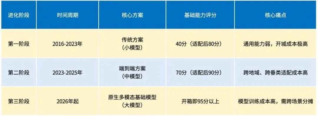 第一阶段(2016—2023年)是传统方案,也就是『小模型』阶段。这一阶段的智驾系统依托高精地图、小感知模型与规则决策规划控制算法,基础能力仅约40分,即便通过大量地域化、场景化的定制化适配,最终也只能做到80分左右。传统小模型模式的核心缺陷是通用基础能力弱、泛化性能差,『开城』代价巨大,每进入一个新城市,都需要重新采集地图数据、适配本地交通规则与驾驶习惯,投入大量人力物力,中小玩家几乎难以承受。