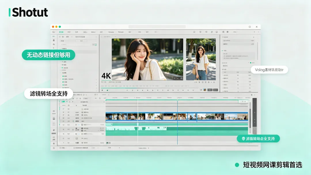 能干什么:视频剪辑,支持4K,时间线/滤镜/转场全有 免费到什么程度:完全免费,开源无限制 适合谁:剪vlog、做短视频,不需要PR那种专业工作流 跟PR比差什么:没有动态链接,特效模板少,多轨编辑不够丝滑 🔗 shotcut.org