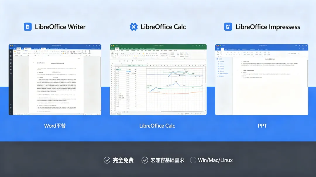 能干什么:Word/Excel/PPT全支持,直接打开.docx/.xlsx不乱码 免费到什么程度:完全免费,开源无限制 适合谁:个人文档处理,不需要在线协作的 跟Office比差什么:界面不现代,协作功能弱,宏兼容性有限 🔗 libreoffice.org