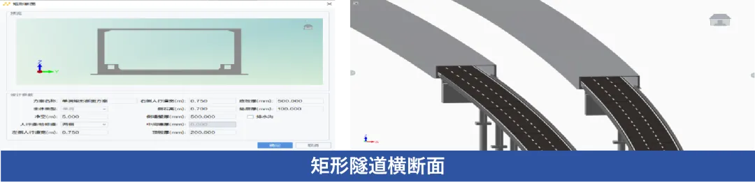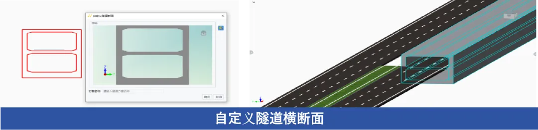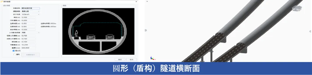 项目规划设计过程中根据地勘数据有两段需要规划为隧道,数维道路软件可支持矩形断面、圆形断面、圆形盾构、单心圆、三心圆、五心圆等断面形式,针对隧道段、洞门、端墙、敞开段、光过渡段等进行隧道方案对比,隧道主体建模包含初期支护、二次衬砌、仰拱、排水沟、电缆槽等,快速完成隧道方案的替换,为规划设计提供数据支撑,提高隧道规划方案选型沟通效率。