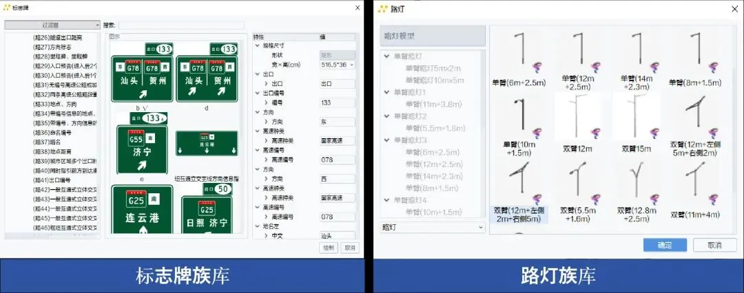 项目涵盖多种道路等级,包含路灯、路牌、声屏障、检查站、收费站、摄像杆、反光栏等路桥附属设施的族文件,通过软件自带.gac及外部构件导入族形成交通规划项目BIM构件库,为后续道路规划项目创建提供参考。
