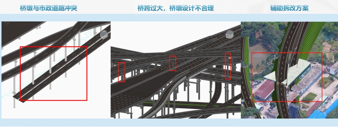 在复杂区域开展构件空间碰撞检查,全面排查道路、桥梁、管线间碰撞,提前调整设计,减少返工、降低成本。通过征迁模拟,为拆改方案的制定提供科学依据与直观参考,助力高效、合理拆改方案快速成型。