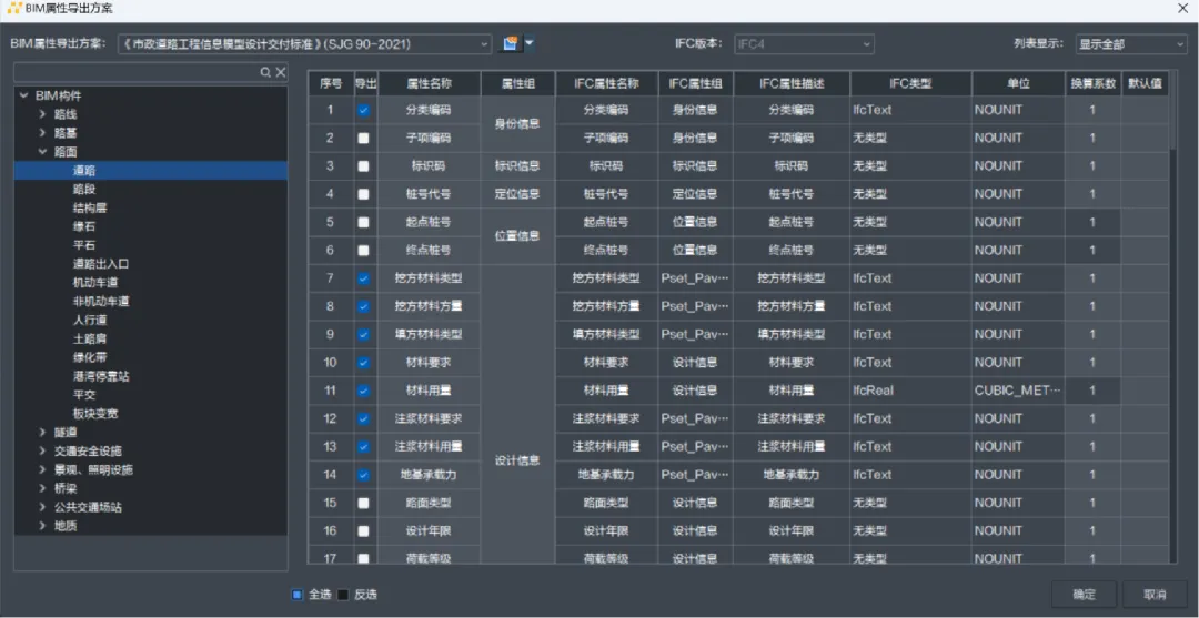 数维道路BIM软件内建了深圳市《市政道路工程信息模型设计交付标准》(SJG 90-2021)交付标准,软件自动生成属性信息,可直接导出模型数据满足深圳市BIM交付要求。