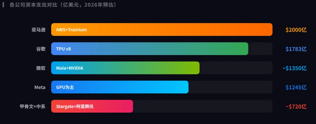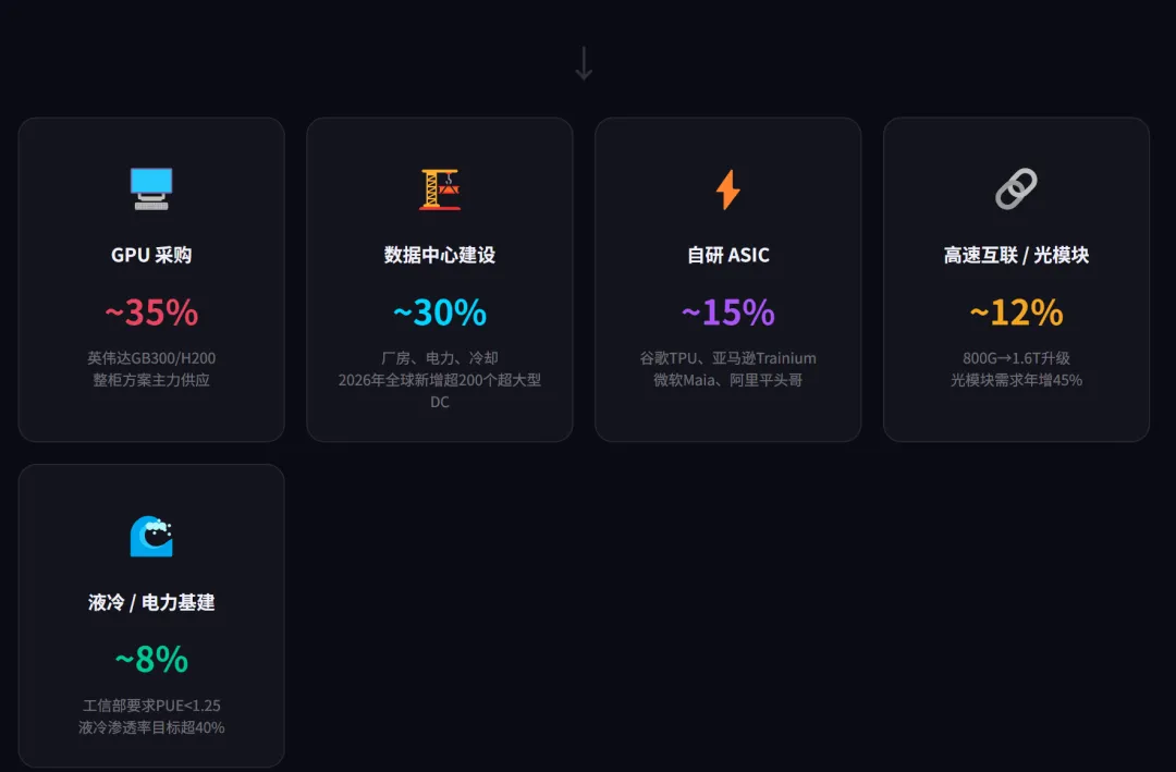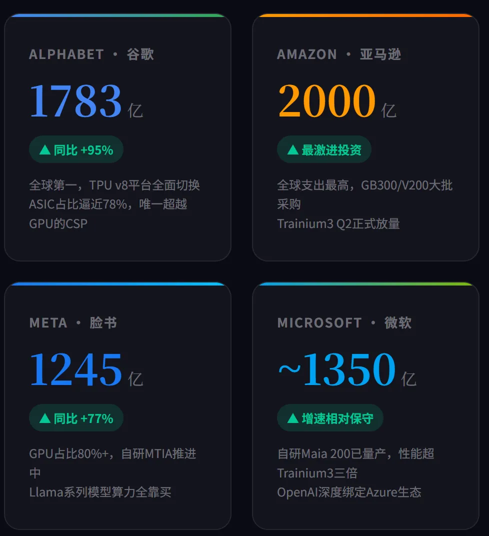 钱流向哪里,谁就是赢家。研究这7100亿美元的具体去向,本质上就是在绘制一张AI产业链的权力地图。这5个方向,揭示了AI军备竞赛的三个结构性特征:硬件仍是核心(GPU+ASIC占约50%);配套基础设施加速补课(网络+冷却+电力占约20%);自研替代在加速(ASIC从5%份额向15%迈进)。在这场军备竞赛中,英伟达无疑是目前最大的受益者。全球八大CSP均大规模采购其GB300、V200整柜方案;Stargate项目中,甲骨文+OpenAI采购额估计超过1000亿美元。正是这些订单,支撑起英伟达市值站稳4.6万亿美元、10连涨的惊人走势。推理市场,云厂商自研ASIC正在系统性侵蚀英伟达的份额。”然而,一场悄然进行的「去CUDA化」运动正在地下蔓延。2026年,云巨头的自研芯片战略从PPT走向量产:云厂商自研ASIC的策略本质是「推理端替代,训练端维持」——推理成本高度敏感,自研芯片可节省30%-50%成本;训练端CUDA生态壁垒太高,短期无法绕开。英伟达的护城河不是消失了,而是被「从推理端开始,从内部消化开始」地缓慢侵蚀。等到推理收入占GPU总营收的60%,那个时间点才是英伟达真正的压力测试。军备竞赛最大的秘密是:「卖水人」往往比「淘金者」赚得更稳。在7100亿美元的资本支出洪流中,有四类产业链环节在默默收割。不是所有人都在欢呼。当微软股价今年已下跌17%、亚马逊跌去9%时,市场在用脚投票一个核心问题:这些钱,能不能回来?💸回报周期之谜:Alphabet自由现金流预计从733亿美元骤降至82亿美元(-90%);亚马逊将出现负自由现金流。2026-2027年是"先烧钱再看回报"的两年空窗期,投资人耐心有限。