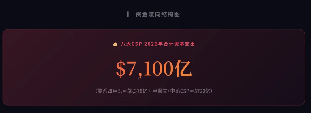 7100亿美元,当科技巨头把这笔钱押注AI钱最终流向了哪里?2026年,Alphabet、亚马逊、Meta、微软等八大云巨头资本支出突破7100亿美元,较2025年暴涨61%。这是人类历史上规模最大的一次单领域集中投资——但这场「AI军备竞赛」的终点在哪里?产业链谁将是真正的赢家?先来看几个让人瞠目结舌的数字。2026年,全球八大主要云服务商(CSP)合计资本支出将突破7100亿美元,同比增幅高达61%。光是美系四巨头——谷歌、亚马逊、Meta、微软——加在一起就接近7000亿美元,几乎是全球GDP排名第18位的国家(荷兰)全年经济总量。更让华尔街咋舌的是:这些钱不是收入,是支出。亚马逊预计2026年将出现170至280亿美元的负自由现金流;Alphabet的自由现金流将从2025年的733亿美元骤降至约82亿美元,同比蒸发90%。投资人问:这些钱什么时候能回来?CEO们的回答是:先烧,再说。注:Alphabet已于2025年11月发行250亿美元债券,长期债务增至465亿美元;亚马逊则在SEC文件中暗示可能寻求股权和债务融资。这场军备竞赛,正在把科技巨头从"现金奶牛"推向"负债增长"的轨道。02 7100亿美元,最终流向五个方向