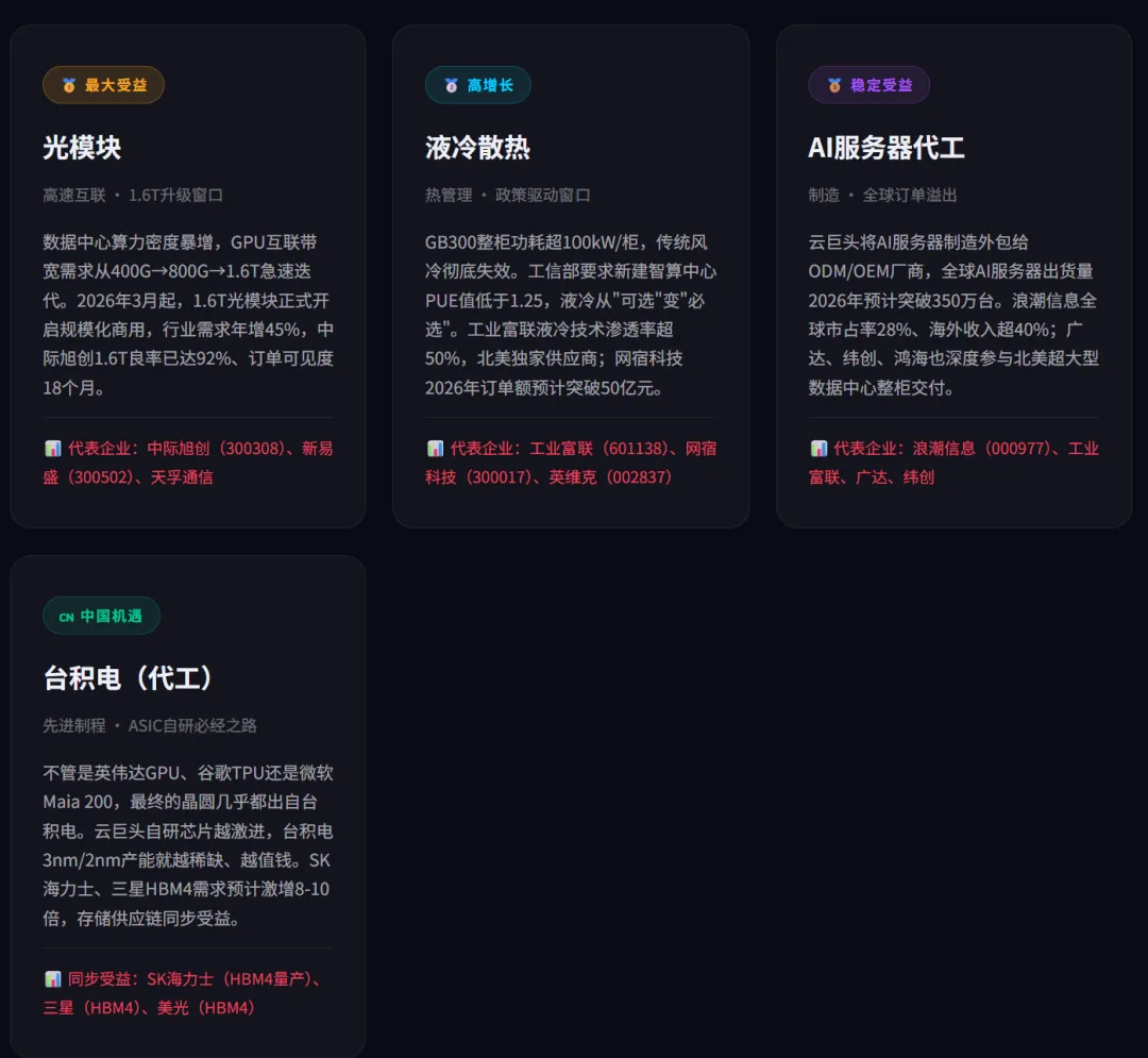 ⚠️估值泡沫风险:产业链部分标的PE(TTM)已超100倍。当前热门的光模块、液冷、AI服务器股票,估值已提前透支2-3年业绩,一旦订单节奏放缓,下跌空间不容小觑。