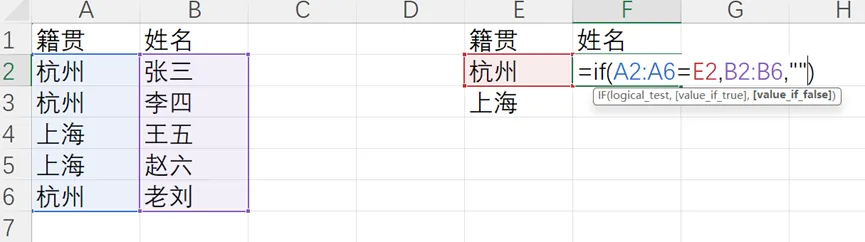 在if函数中进行一个数组判断,如果a列的值等于杭州,那么把那行b列的值显示出来,如果不等于杭州,就显示空值