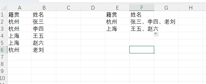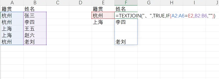 将姓名按照籍贯分类,再横着拼起来。需要用到textjoin函数和if函数。