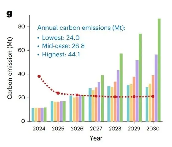 从系统层面看,其影响正在快速增长。仅在2025年,AI系统就可能产生3260万至 7970万吨的二氧化碳排放。到2030年,AI 驱动的数据中心每年可能新增 2400 万至 4400 万吨二氧化碳排放。
