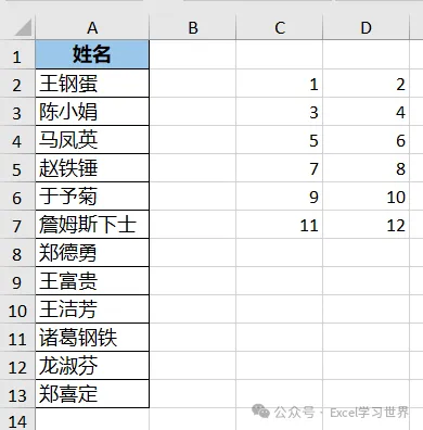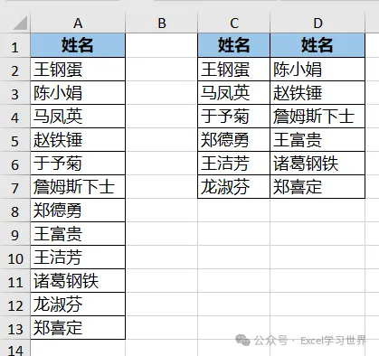将下图 1 中的姓名按 C、D 列的排列顺序转换成两列,效果如下图 2 所示。