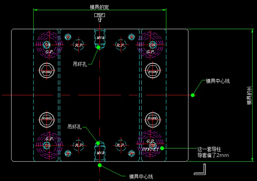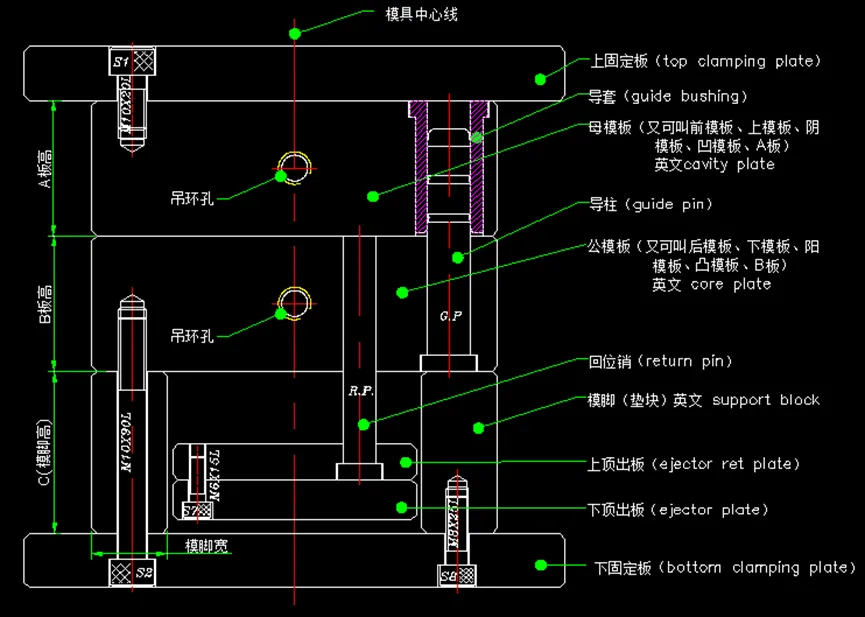 二板模具结构拆解:从模板到螺丝,一篇讲清所有核心零件模具行业里,二板模具是应用最广泛的基础结构之一,但不少新手刚接触时,总被繁杂的零件名称绕晕:面板和底板有啥区别?导柱导套为啥要做长短差?别慌,今天我们就把二板模具拆解得明明白白,从模板类零件到细小的固定螺丝,带你逐个认识它们的作用和装配逻辑,看完就能轻松搞懂二板模具的核心结构。1、模板类零件:面板(上固定板)、底板(下固定板)、前模板(A板或者母模板)、后模板(B板或者公板板)、顶针面板(上顶出板)、顶针底板(下顶出板)、模脚(方铁)。 螺丝S1 -- 锁紧面板和A板,(请参照上面的图示),小模架4个,大点的模架6个。 螺丝S2 -- 锁紧底板和B板,螺丝通过了模脚,模脚上的螺丝孔是避空的。此螺丝小模具有4个,大点的模具有6个。S2的大小及到两个模具中心线上的距离和S1是一样的,不一样的地方只有长度而已。 螺丝S7--锁紧顶针板,一般在顶针板上的每个角会有一个,共4个。 螺丝S8--锁底板和模脚,小模具4个,大模具6个。 3、定位导向零件: 导柱和导套--每套模具有4组。注意:为了避免模具在组装时出现装反的情况,有一组导柱导套(基准角这一组)在长度方向上到模具中心线的距离与其它三组导柱导套在长度方向上到模具中心线的距离小2mm。所有标准模架都是如此。 4、回针: 回针—每套模具4个,脑头在顶针板上,再穿过B板。 5、吊模孔: 此孔为螺丝孔,模架越大,螺丝也也就越大。作用就是方便模具的吊装或者搬运。A板和B板上必须要有,模架大的时候,其它板子也要有吊模孔。点击 -->>:学习资料,免费领取全套塑胶模具设计学习资料!