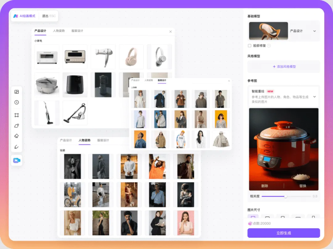 - 方案发散和原型生成:这部分交给AI来做。设计师把要求说清楚,AI一次性生成几十上百种方案,帮设计师打开思路,快速迭代原型,把原本一周的工作缩短到一天。