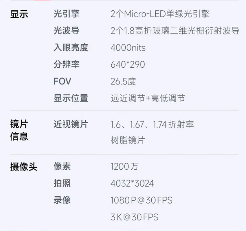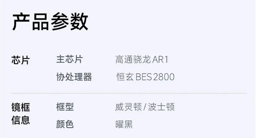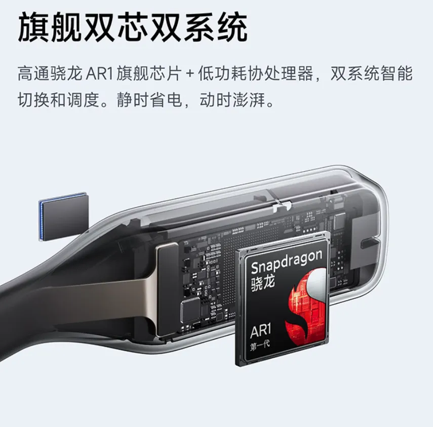 搭载高通第一代骁龙AR1芯片,采用双光机双目Micro LED近眼显示方案,入眼峰值亮度达4000尼特,即便在户外大太阳底下也能清晰可视。影像系统配备1200万像素摄像头,支持3K视频录制与超级夜景拍照。