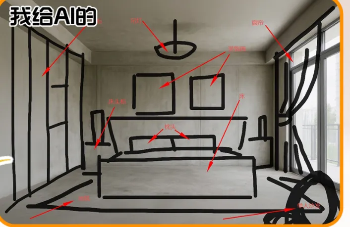 没有复杂建模,没有繁琐参数。我们直接在客户真实空间的照片上,顺着现场尺度和动线,把床、衣柜、沙发的大致位置勾出来。