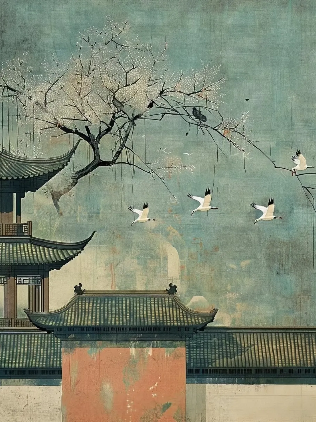 于是我们输入给AI的,不是一串干巴巴的提示词,而是一张带着青绿山水、白鹤意境的东方画面。