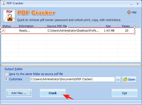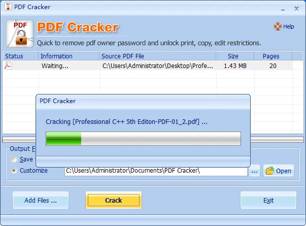 PDF Cracker可直接移除PDF所有者密码,一键解除编辑、复制、打印等权限限制,快速生成无密码新文件,解密不受密码复杂度影响,即时生效。