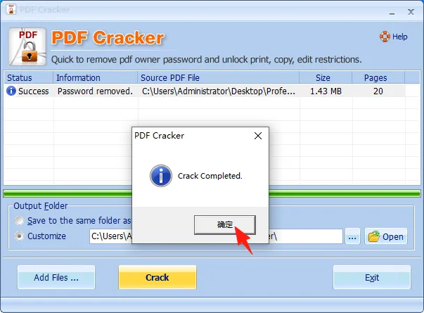 使用PDF Cracker解密PDF十分简便,只需通过Add Files或拖拽方式导入文件,点击Crack即可开始解密,完成后确认提示即可。
