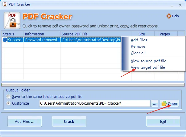 解密完成后,可右键选择查看目标文件,或通过Open打开文件所在位置,快速查看已解锁的PDF。