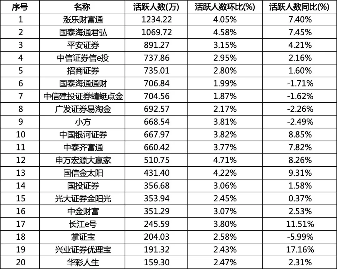 国信证券金太阳、申万宏源大赢家同比增幅均超过8%,中国银河证券、中泰齐富通同比增幅亦在7%以上。近年来,不少券商在精细化运营与产品体验升级方面持续投入,逐步转化为用户规模的稳步增长。