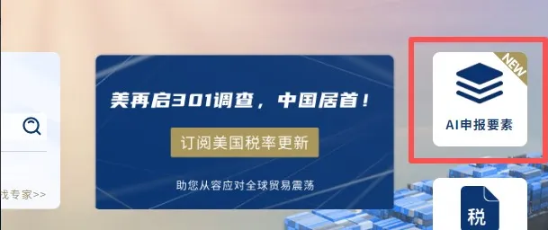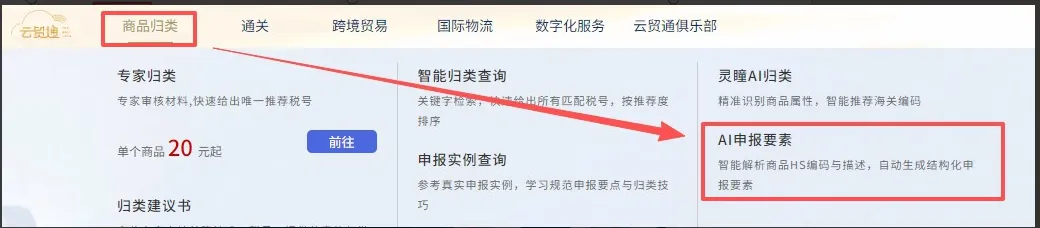 当前版本新增了“AI申报要素”的全新智能工具,您可以通过平台顶部的“商品归类”菜单或直接点击首页的NEW功能块进入。