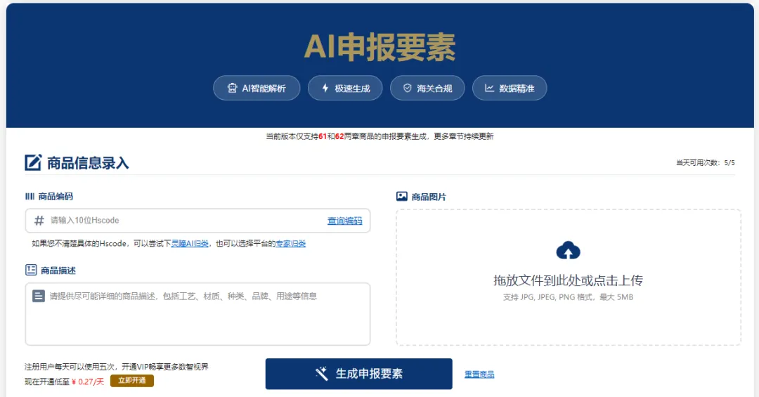 目前AI模型支持61和62这两章的服装类商品进行申报要素自动生成