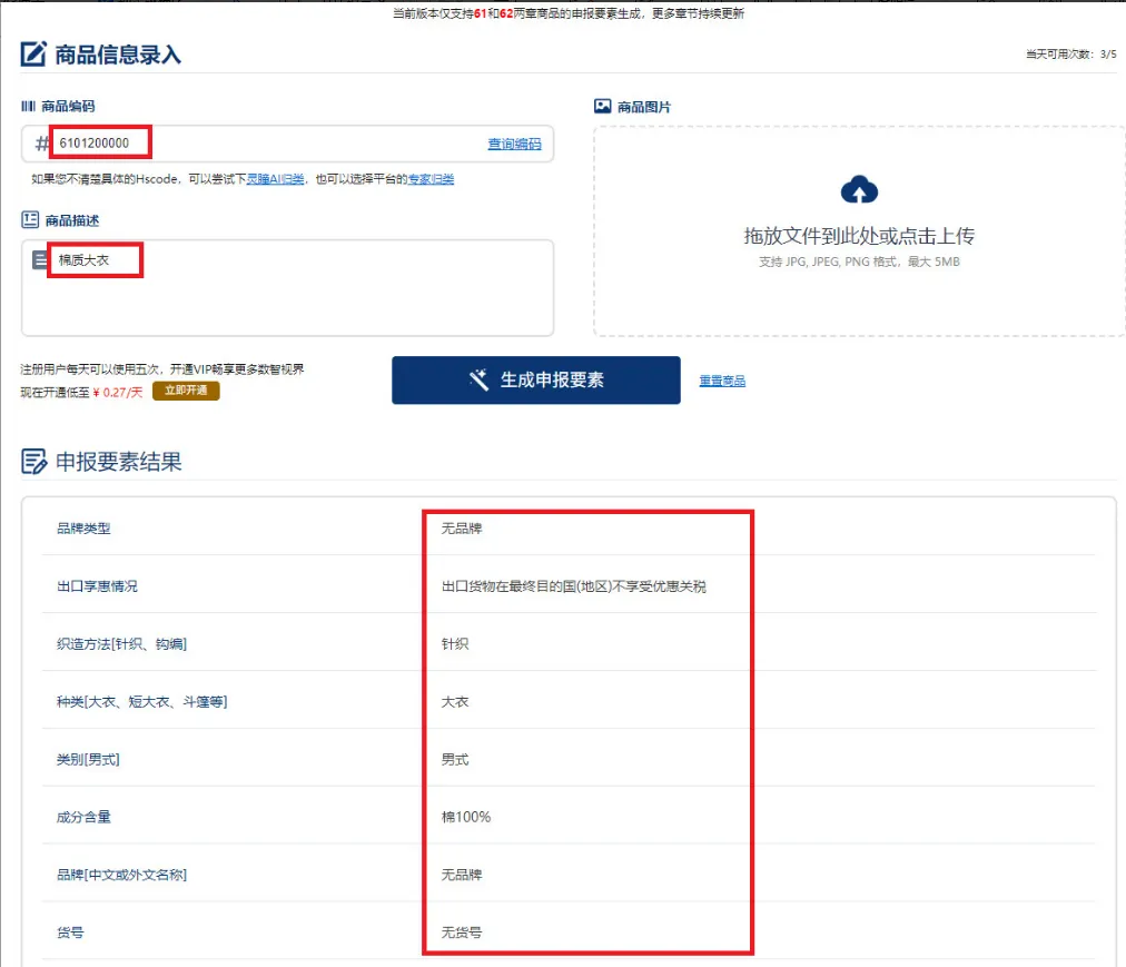 比如这里的hscode我们输入“6101200000”,对应的商品品名是“棉制针织或钩编的男式大衣、短大衣、斗篷、短斗篷、带风帽的防寒短上衣(包括滑雪短上衣)、防风衣、防风短上衣及类似品”,在描述这里我们只是简单的输入了“棉质大衣”,然后直接进行生成。