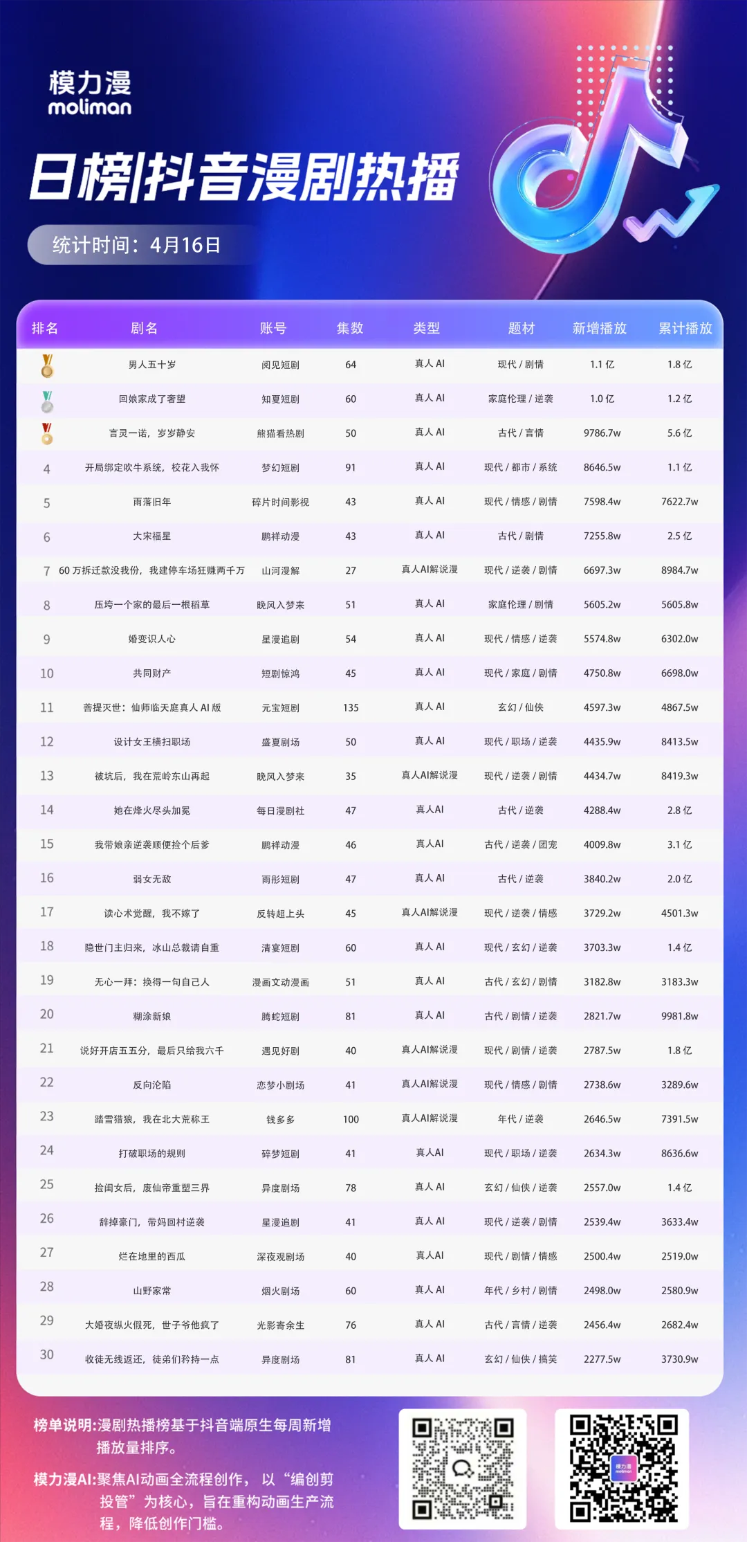 4月17日漫剧日榜,都市逆袭真人AI剧《男人五十岁》 新增1.1亿,登顶榜一!爆款规律都市逆袭真人AI剧《男人五十岁》 新增1.1亿,登顶榜一!真人AI绝对主导,家庭伦理/逆袭持续高热,是稳定流量池。系统流男频成为新增长点,《开局绑定吹牛系统,校花入我怀》验证“系统+都市+爽文”模式可行。联系我们试用模力漫AI工具了解更多信息欢迎添加 备注来意点击左下角 关注我们