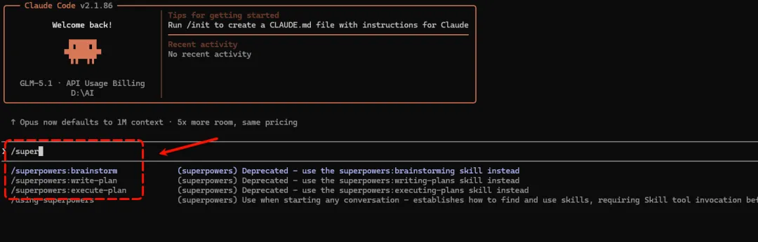 安装后,重启 Claude Code,然后,你的 Claude Code 就获得了一整套 Skills。输入 / 就能看到以 superpowers: 开头的命令。