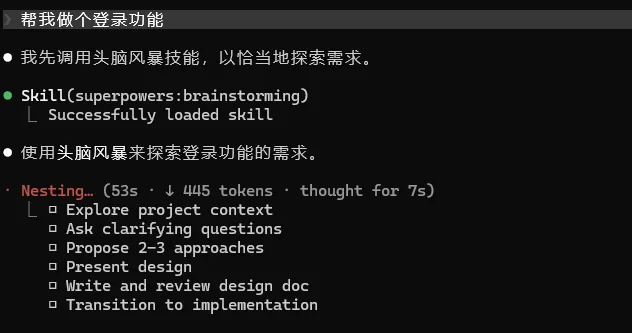 触发方式:比如当你说"帮我加一个用户登录功能",没有 Superpowers 的 Claude 会直接开始写代码。有了 Superpowers,它会先进入 Brainstorming 模式,用苏格拉底式提问帮你理清需求: