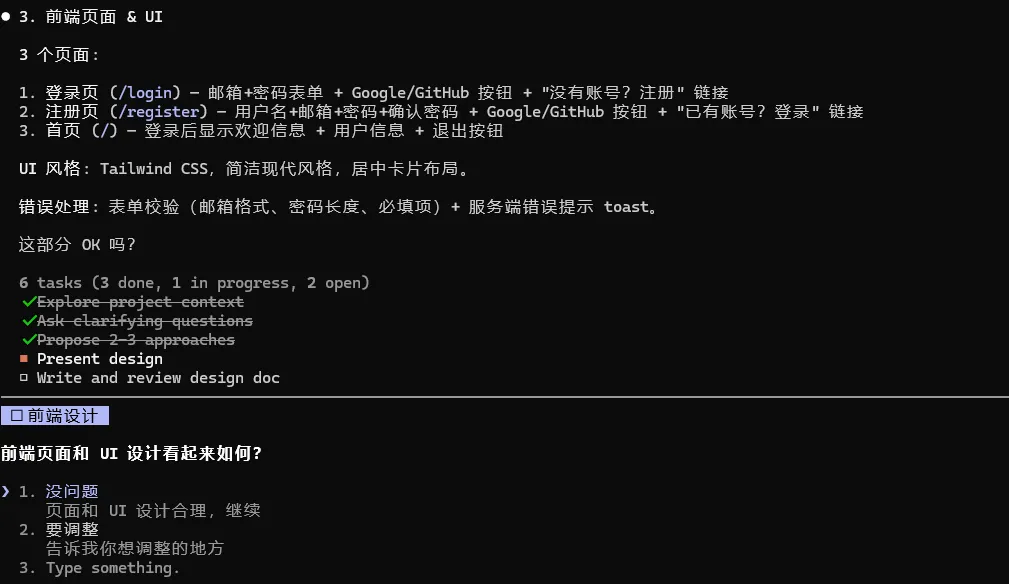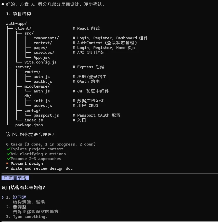 你回答这些问题后,它会生成一个结构化的设计摘要,确认你同意后才进入实现阶段。