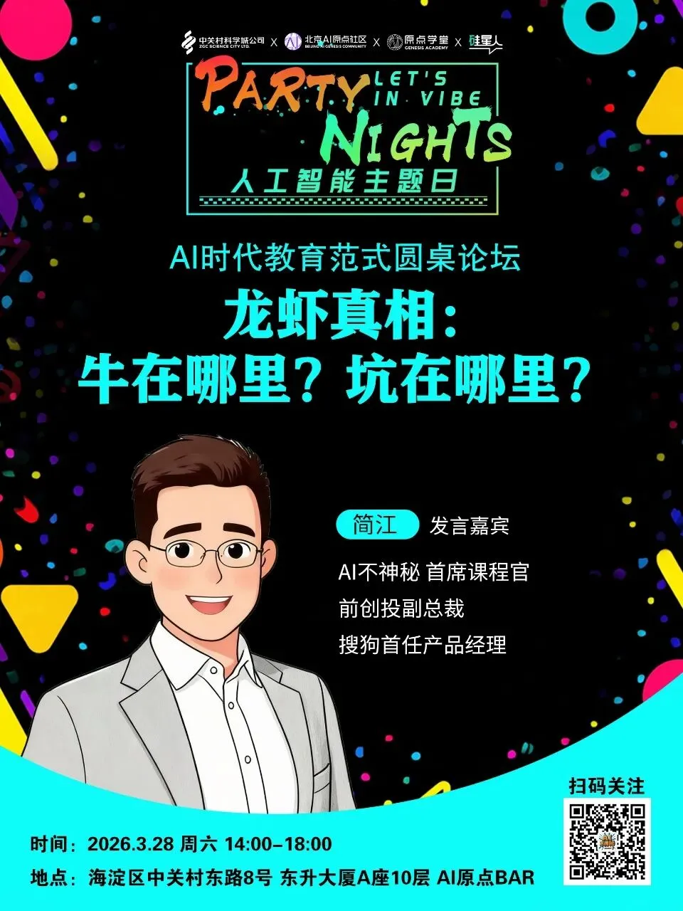 3月28日,中关村科学城、硅星人、原点社区、AI不神秘联合举办四小时 AI 教育专题活动。从圆桌论坛到龙虾黑客松,再到孩子们的 TED 路演,大人聊完观点,孩子直接上手。