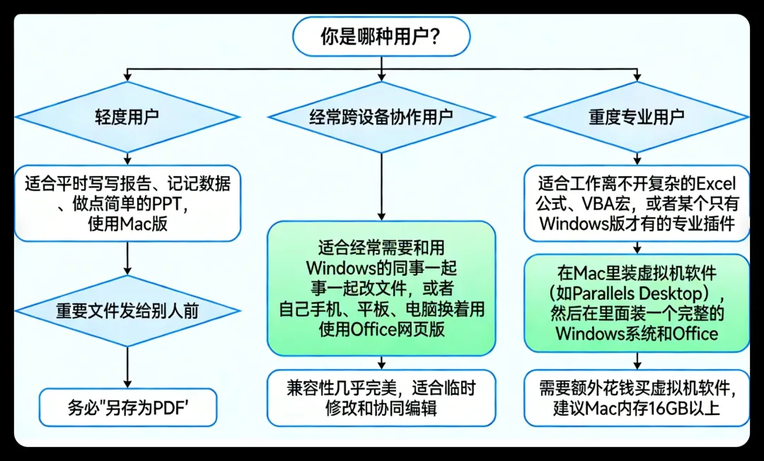 我自己的方案是:日常95%的时间用Mac版,享受它的清爽和稳定;遇到非要Windows才能搞定的复杂表格,就开网页版或者虚拟机。 这样搭配用了大半年,还没耽误过什么事。