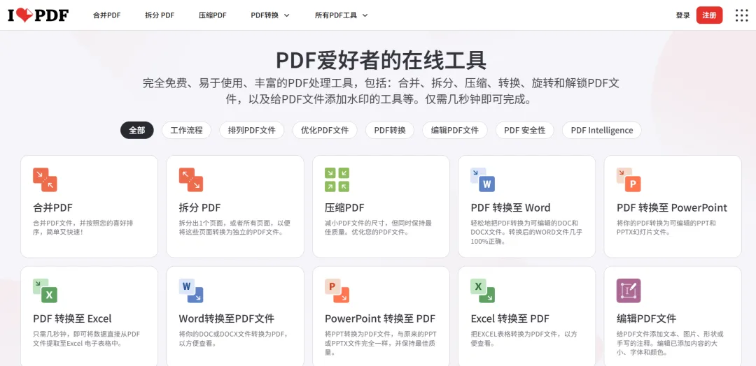 我爱PDF网址:https://www.ilovepdf.com,可能是你所苦苦寻找的那个它。PDF爱好者的在线工具是一个完全免费、易于使用、丰富的PDF处理工具,包括:合并、拆分、压缩、转换、旋转和解锁PDF文件,以及给PDF文件添加水印的工具等。仅需几秒钟即可完成。